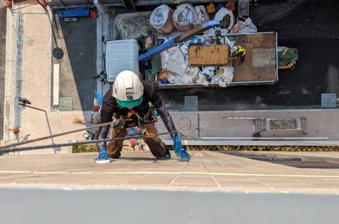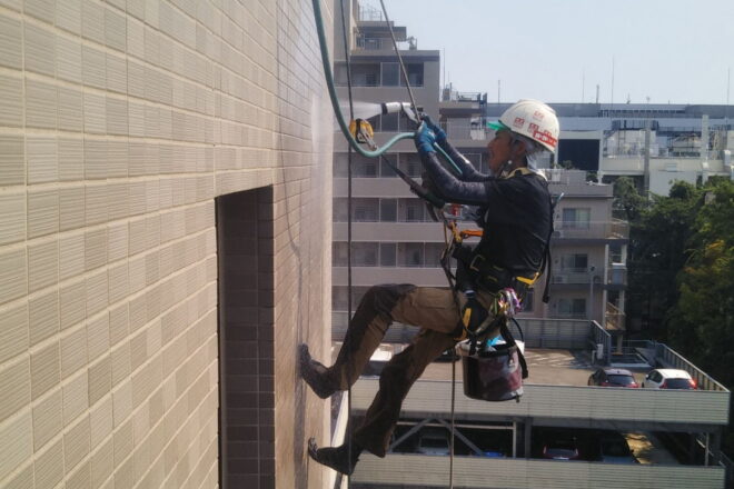 全体的な洗浄でしたら足場を掛けた方が効率的ですが、部分作業ならロープアクセスの方が、